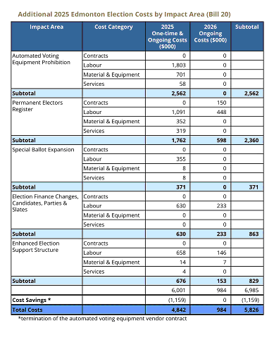 The Alberta government passed a new law for local elections and as a result the 2025 Edmonton election will end up costing almost $5 million more than previously budgeted. Although there is no evidence of voter fraud in Alberta associated with vote-counting machines, the Alberta government's new law stipulates that all ballots most be hand counted and a permanent electors list must be established. The city will need to hire more temporary election workers for advance and regular voting days, plus more temporary or short-term employees for other work related to the election. In addition to more manpower Edmonton will have to print 1.6 million extra ballots and 240,000 more voter information cards.